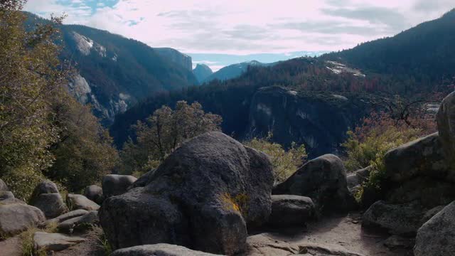 Slow dolly right with foreground rocks looking over Yosemite valley.