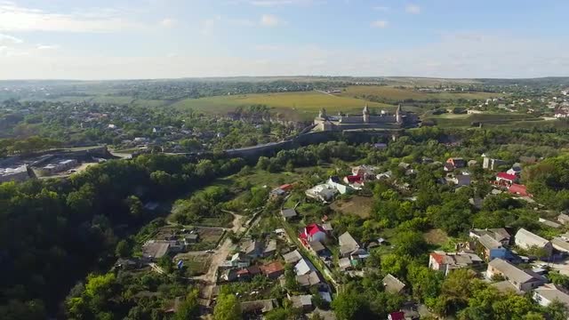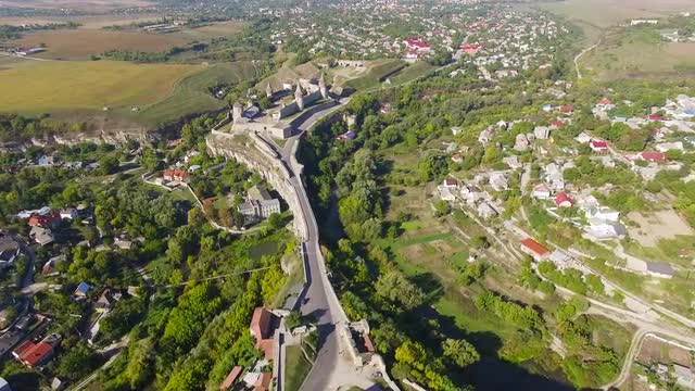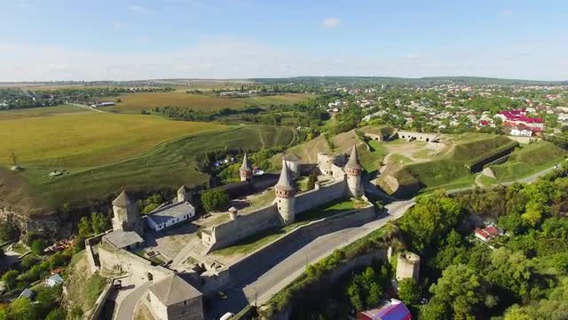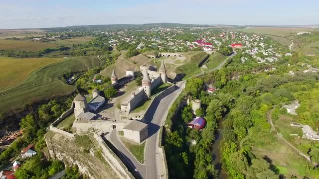 580159 - Backwards overflight aerial shot of a medieval castle in the lake landscape in Finland