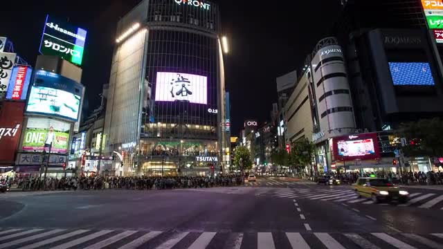 Time lapse pan-up footage of pedestrians and vehicles at Shibuya scramble crossing at night, Tokyo,