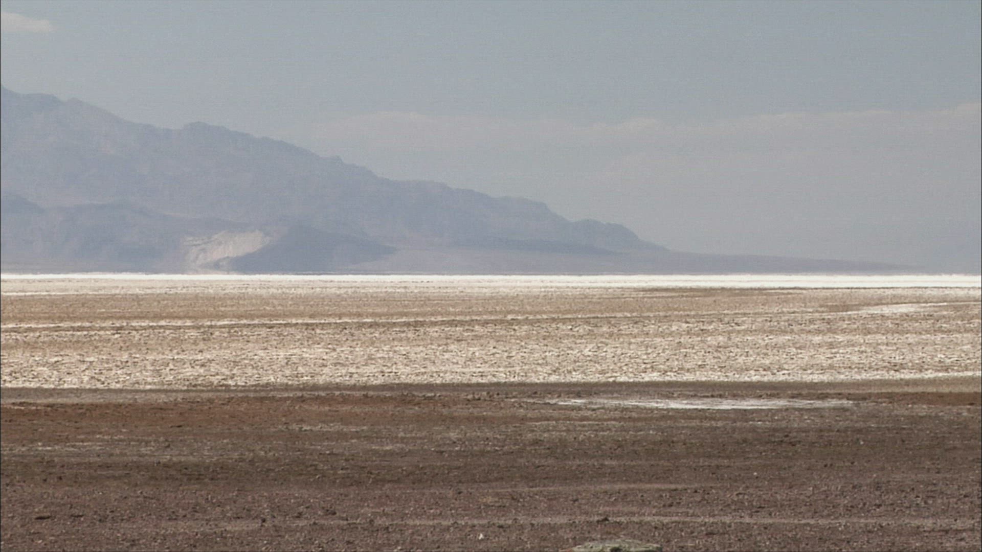 Low and wide, camera slides right across a desert road at Teakettle junction in Death Valley National Park.