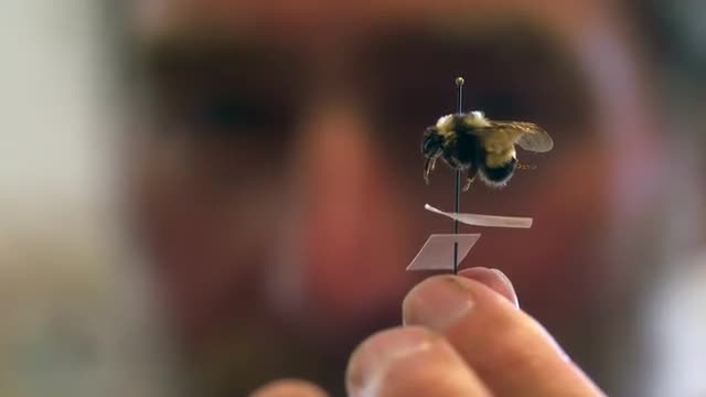 Closeup of a man's hands pointing out features of a bumblebee specimen on a pin.