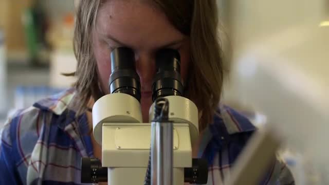 A man looks through a microscope, subject unclear. B-roll style.