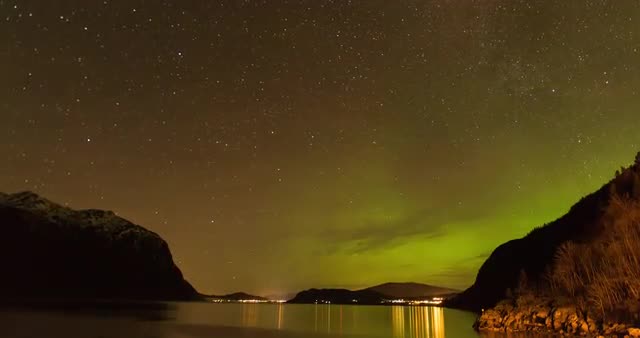 963958 - Timelapse of northern lights at night with fjord and beautiful landscape in view