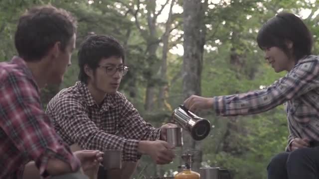 > Slow motion footage of friend enjoying cofee at a camp site, Yamanashi Prefecture