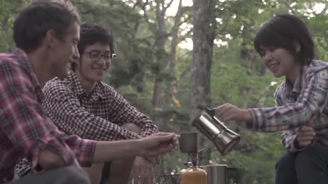 Slow motion footage of friend enjoying cofee at a camp site, Yamanashi Prefecture