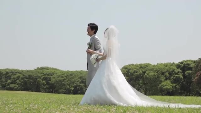 > Japanese bride and groom in a city park
