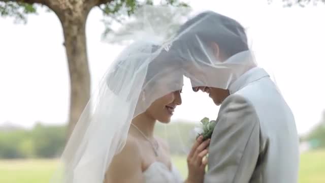 > Japanese bride and groom in a city park
