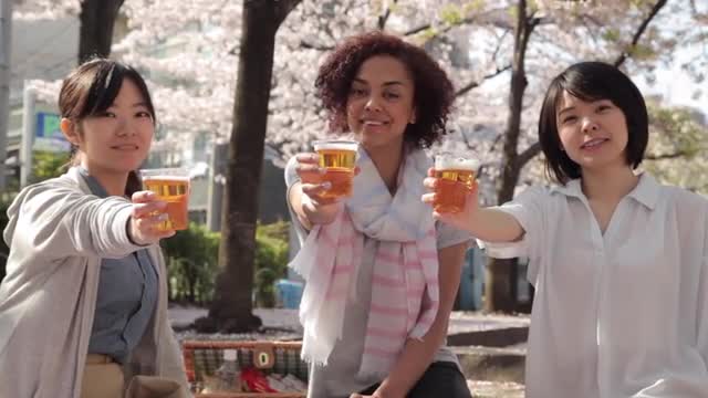 > Multi-ethnic group taking a selfie during hanami party in Tokyo