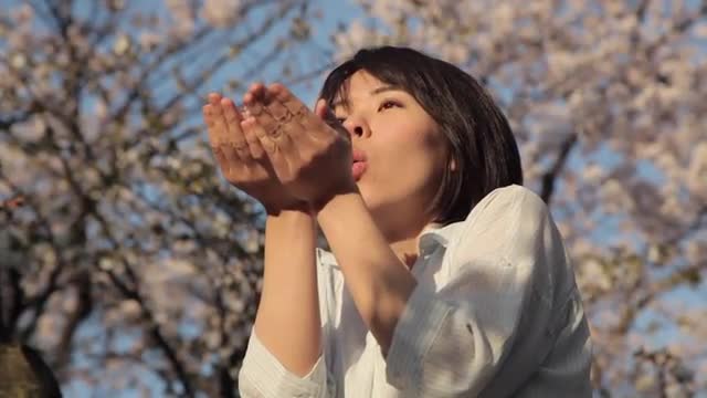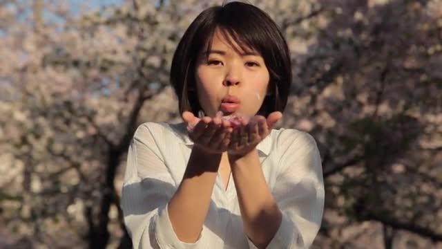 Japanese young mother and daughter enjoying cherry blossoms in a city park