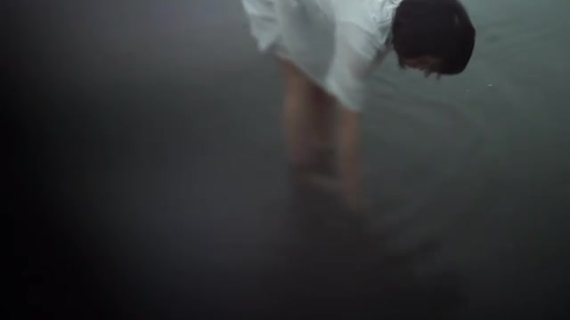 > Young Japanese woman barefoot in the water at city beach, Tokyo, Japan