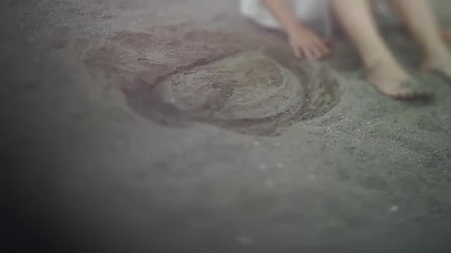 > Young Japanese woman playing with sand at a city beach, Tokyo, Japan