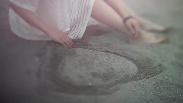 > Young Japanese woman playing with sand at a city beach, Tokyo, Japan