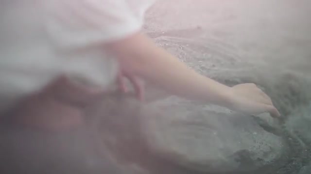 > Young Japanese woman playing with sand at a city beach, Tokyo, Japan