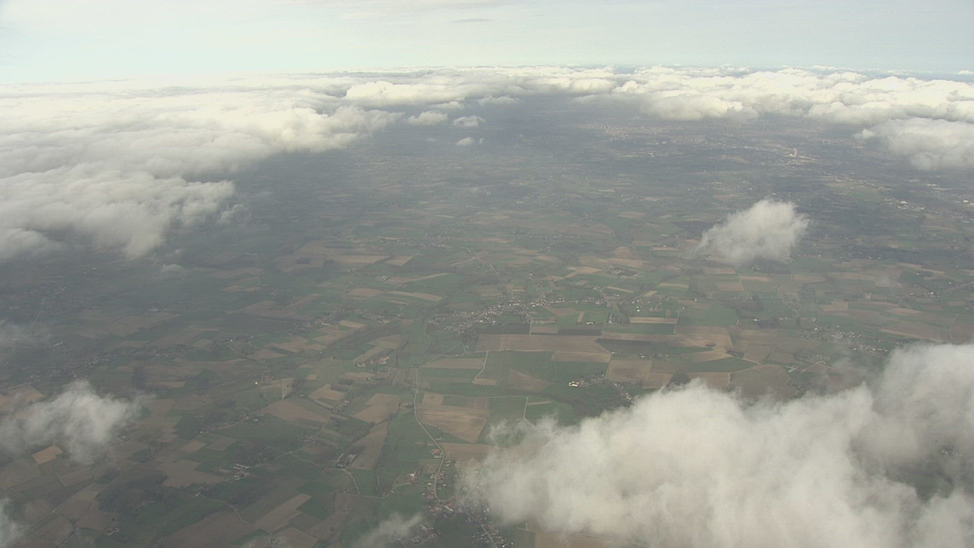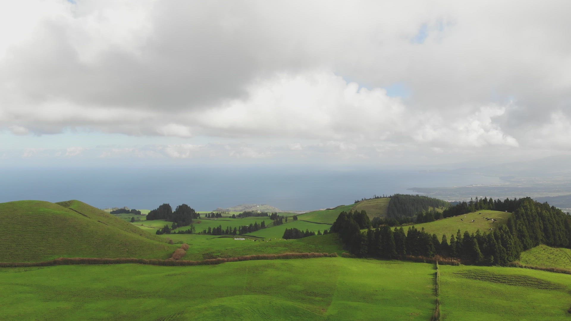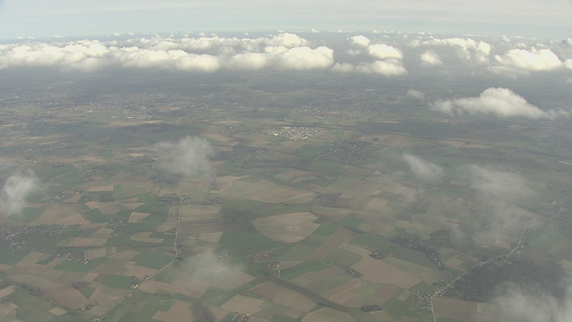 An ascending aerial flyover tree line reveals crops in rows and blue skies and clouds.