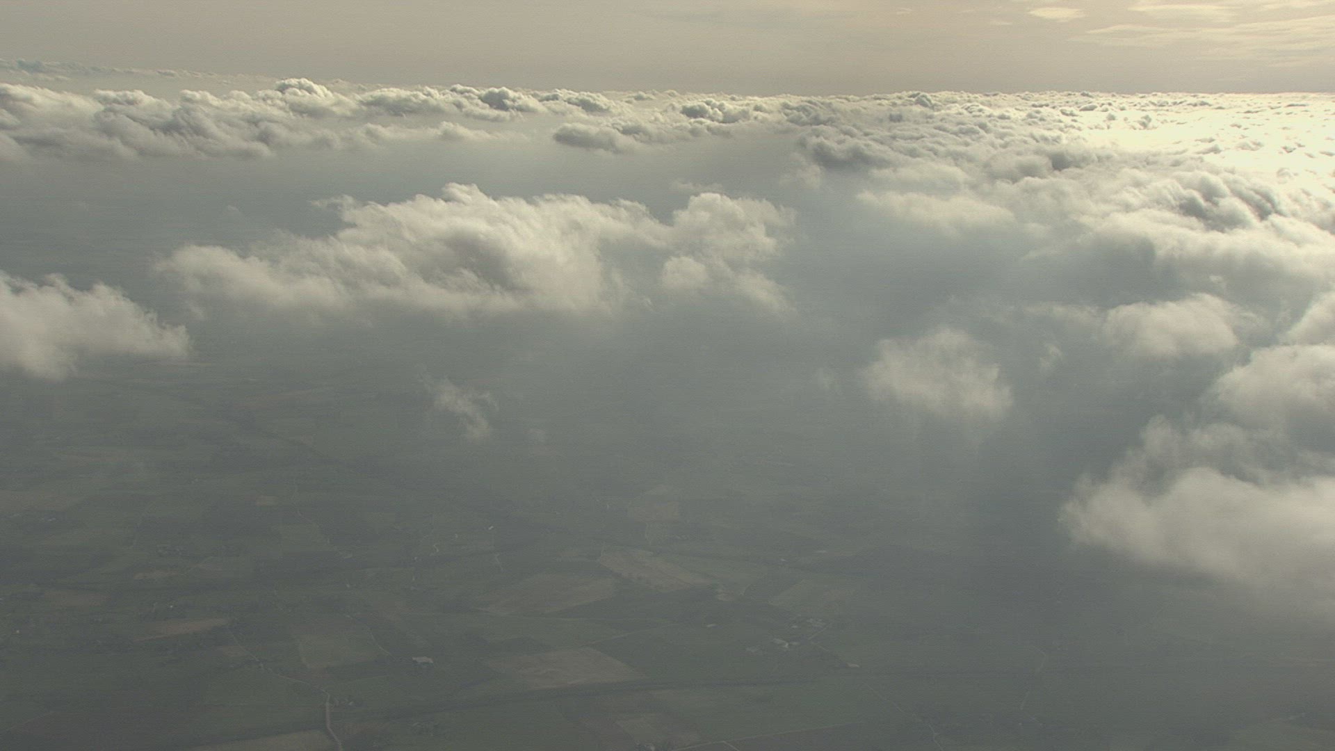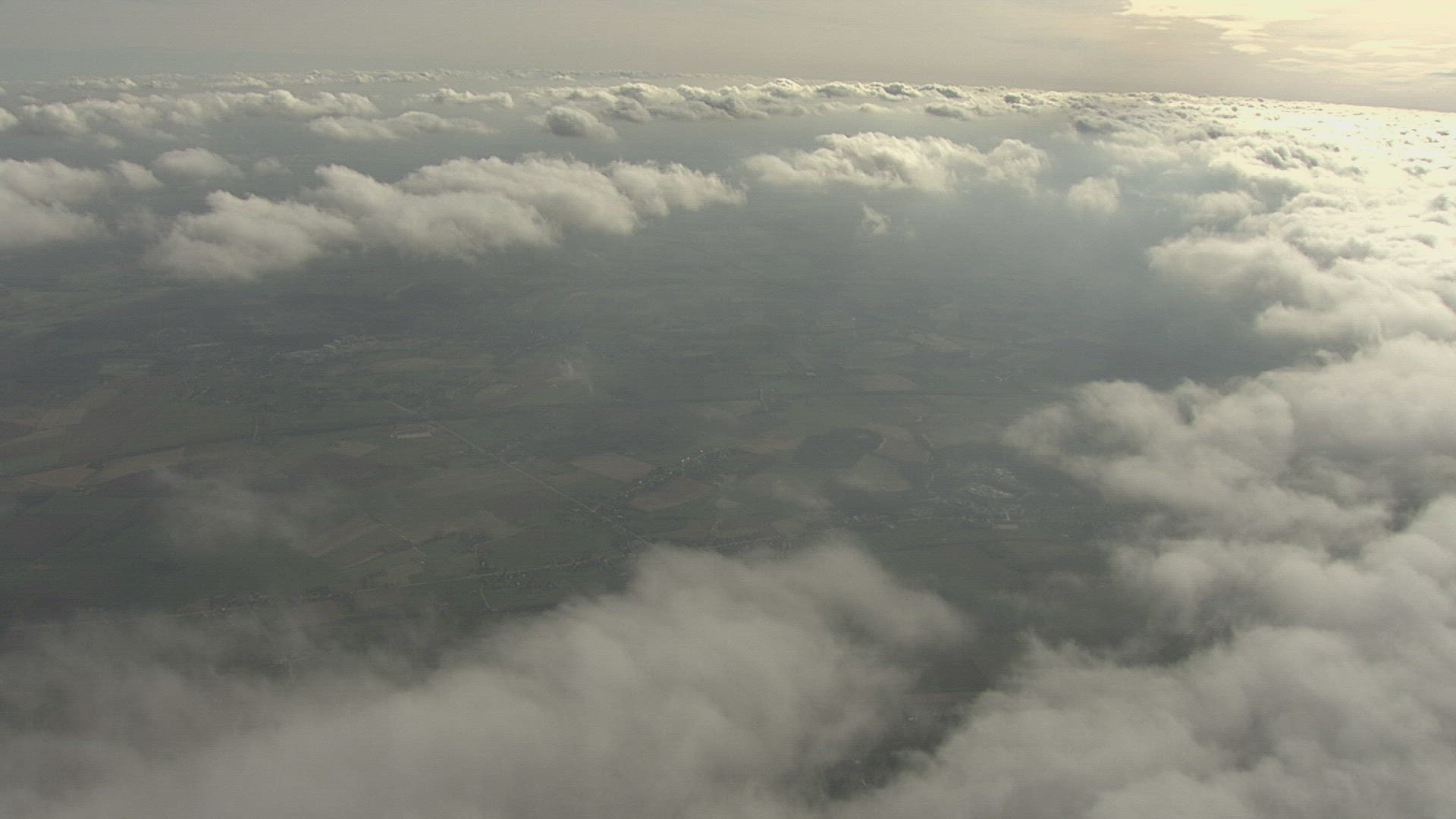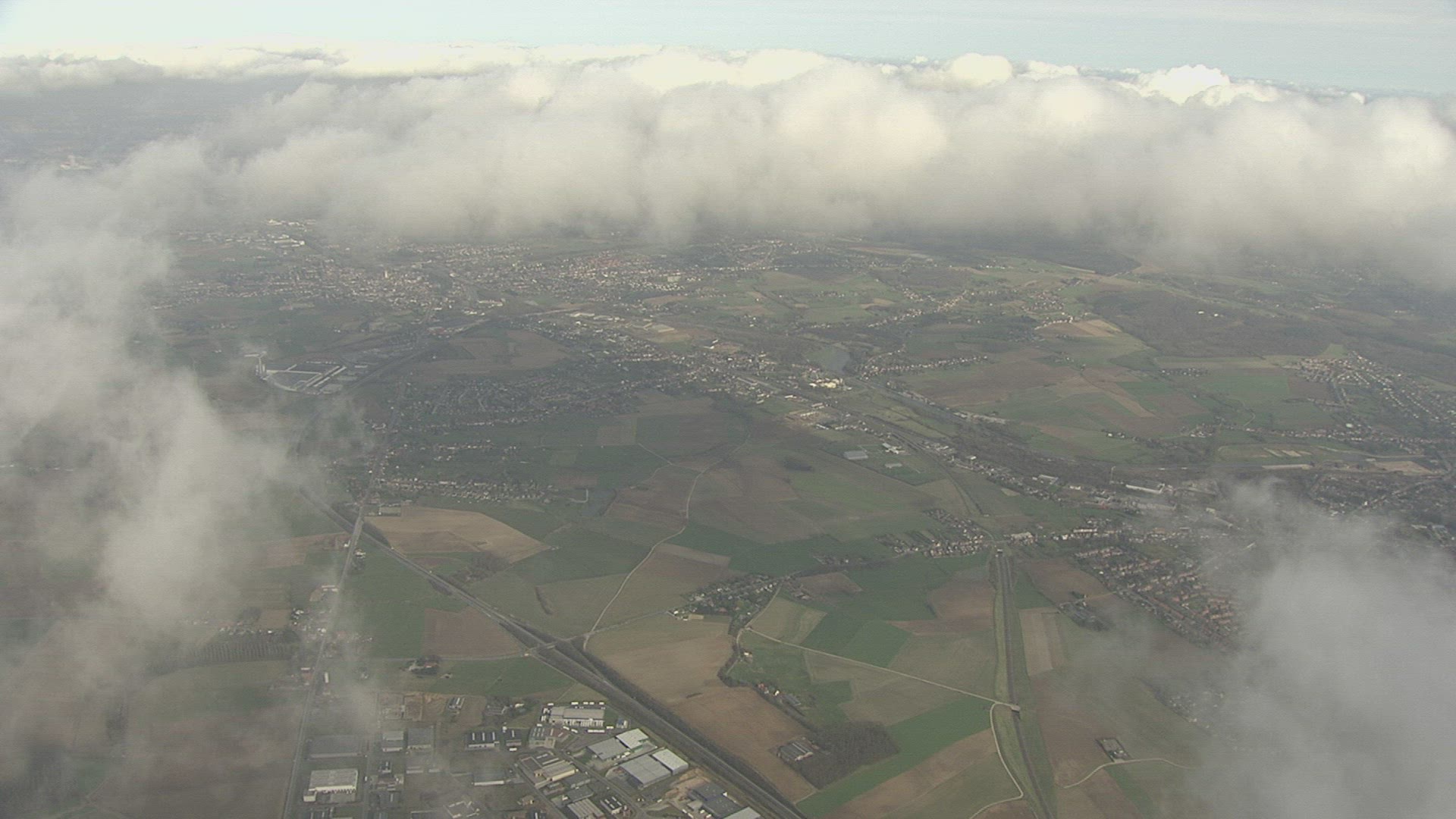 An ascending aerial flyover tree line reveals crops in rows and blue skies and clouds.