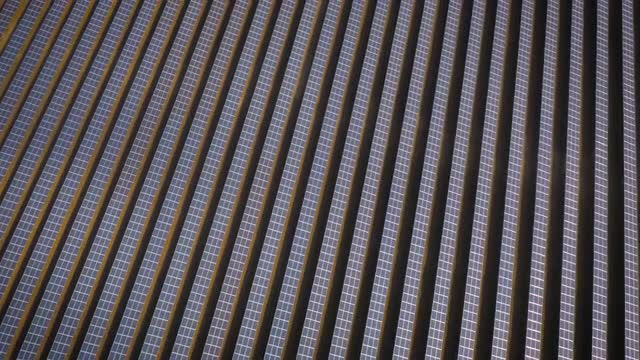 434310 - Birds-eye view aerial drone footage of UK solar panel farm