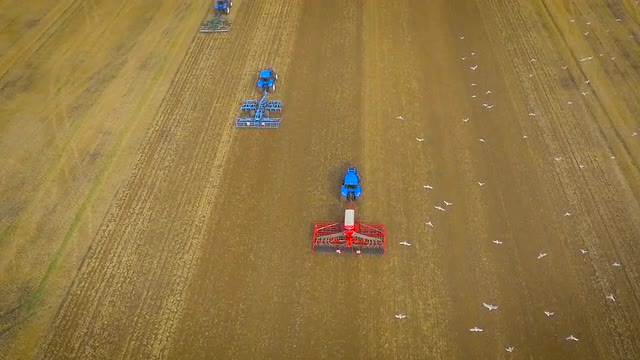 435216 - Aerial drone footage, slow motion birds-eye view of tractors ploughing field and bird flying