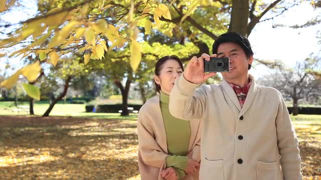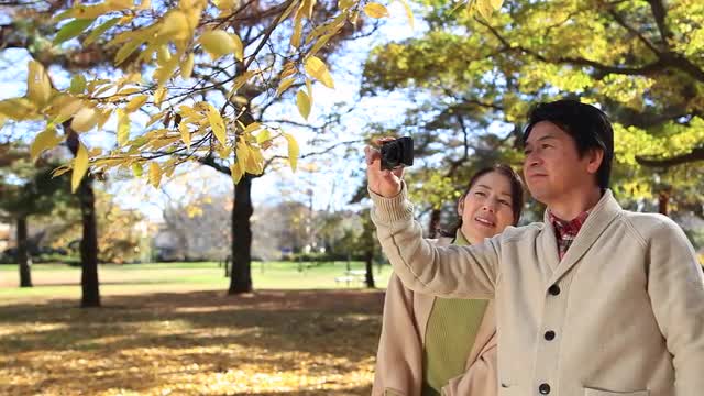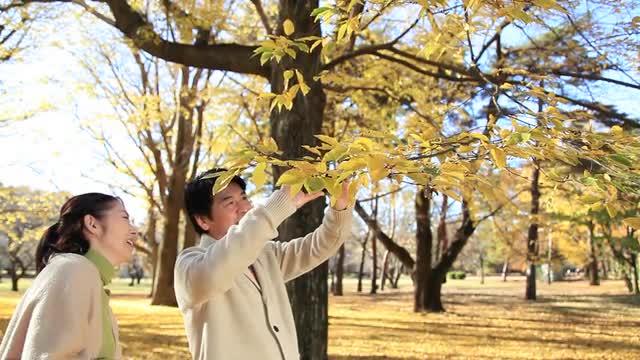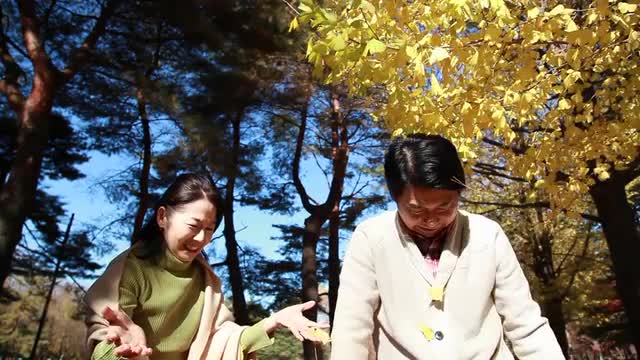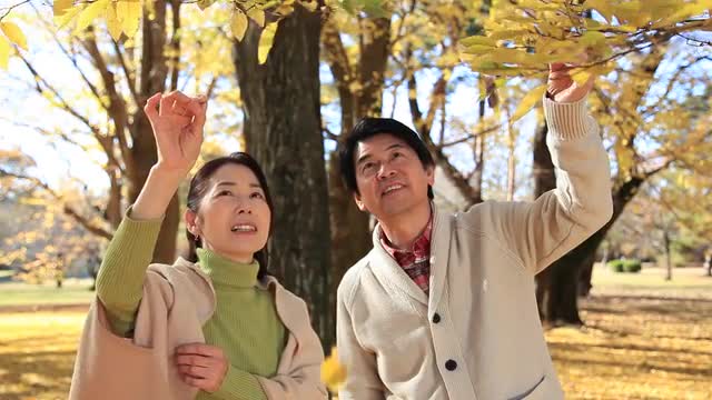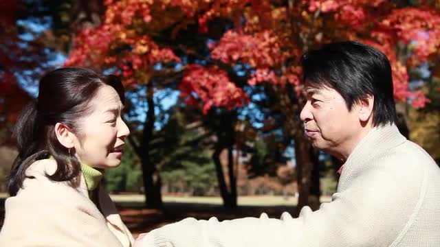 > Japanese senior couple blowing dandelions