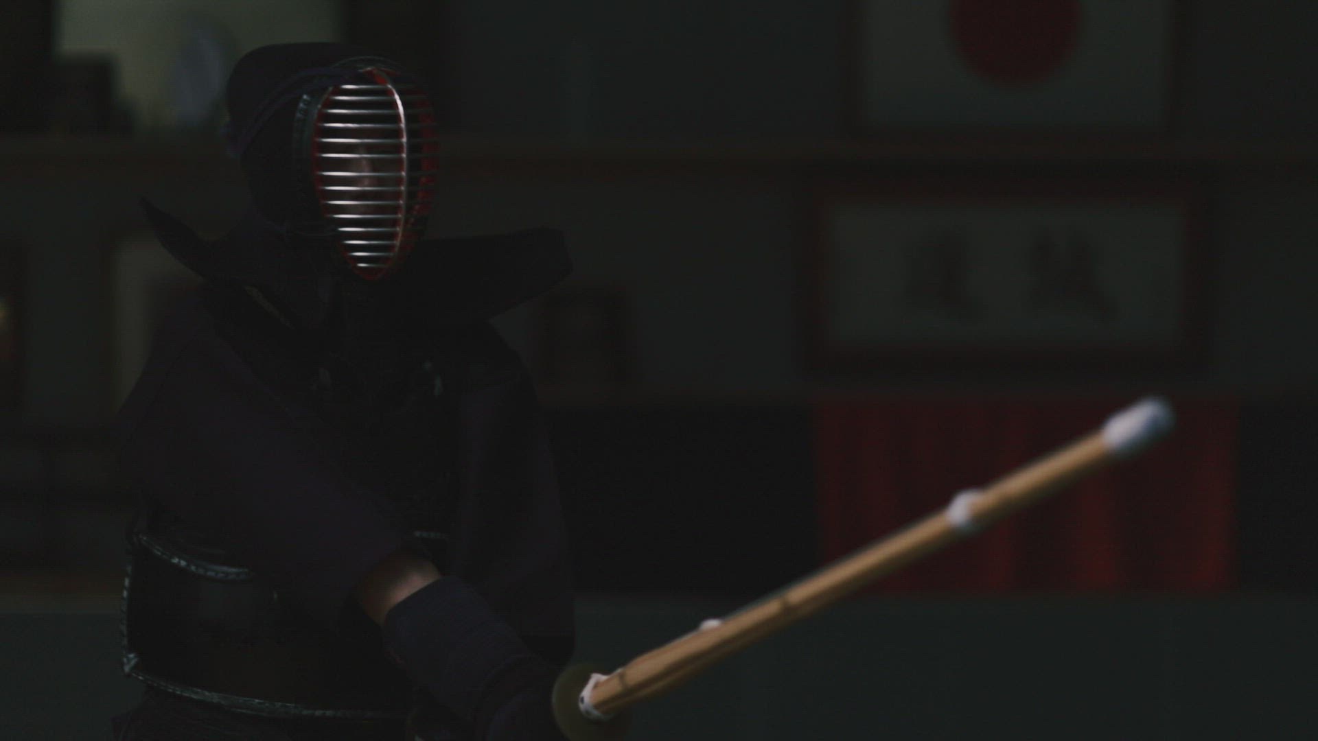 Mature Japanese woman in a kimono with red parasol walking in a bamboo forest
