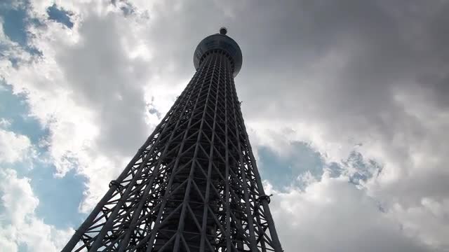 > Low angle view of Tokyo Skytree against cloudy sky, Tokyo, Japan