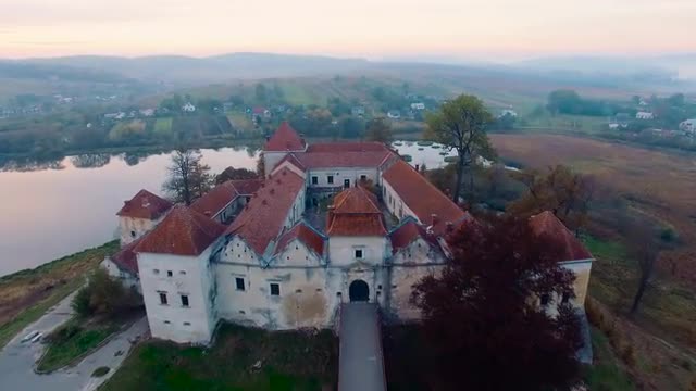 Aerial view of Peles Castle in the mountains shot smooth touch forward very good shot