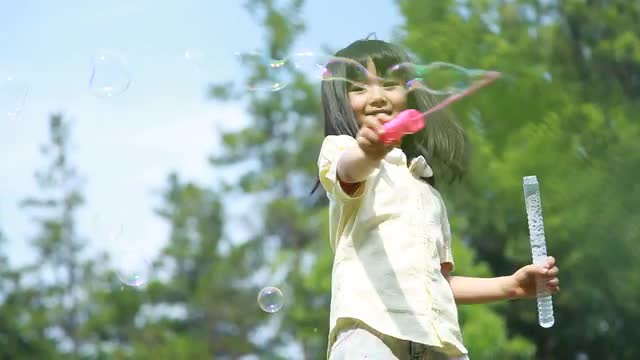 > Japanese young girl playing with soap bubbles in a park, Tokyo, Japan