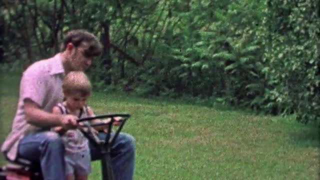 > 1967: Father son riding lawn mower together teaching how to drive.