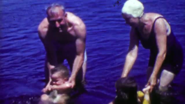 > 1952: Grandparents playing with kids in lake water vacation beach.