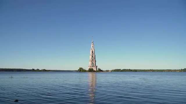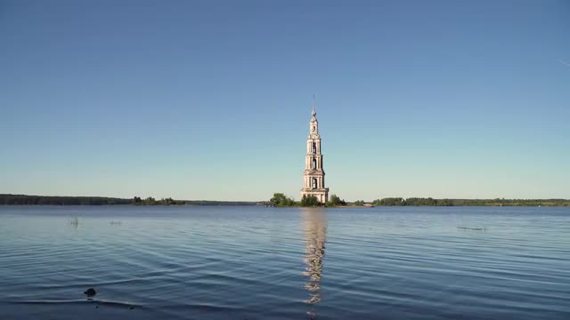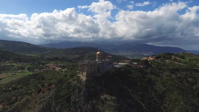 Aerial view over cathedral on countryside in mountains at sunset HD