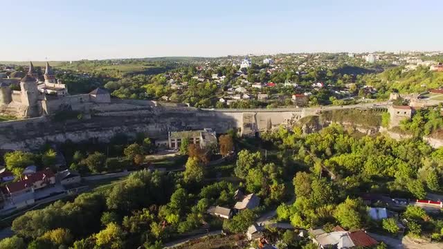 Aerial view Flying camera over of the old castle. Ukrine. aLviv. Pidgirtsi. Travel tourism adventure in wild nature camera bird eye view