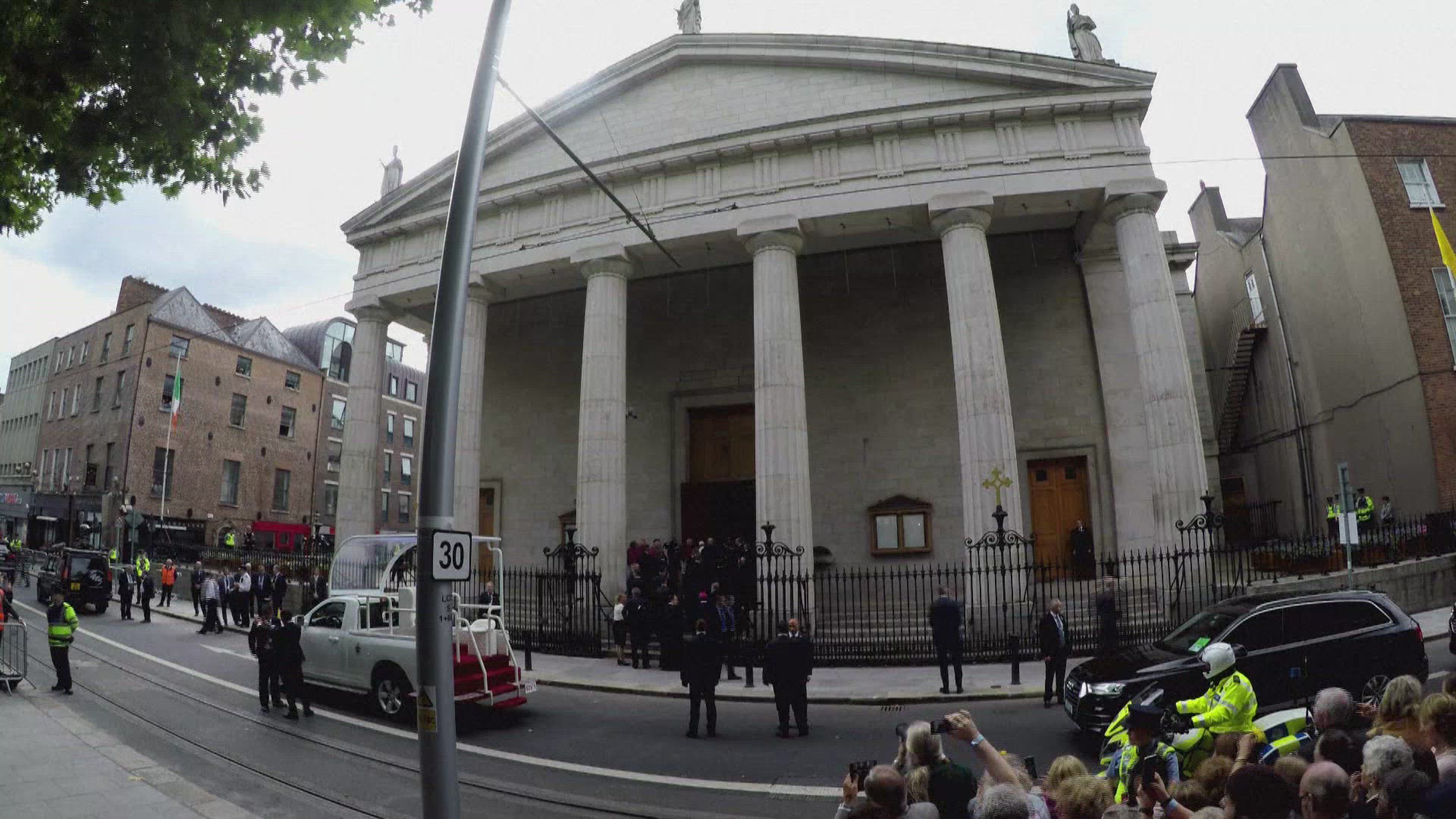 550693 - Aerial view over cathedral on countryside in mountains at sunset
