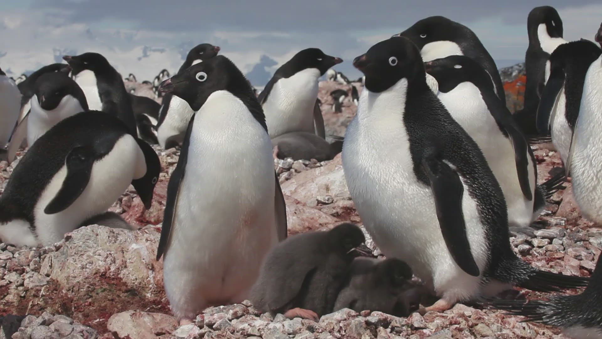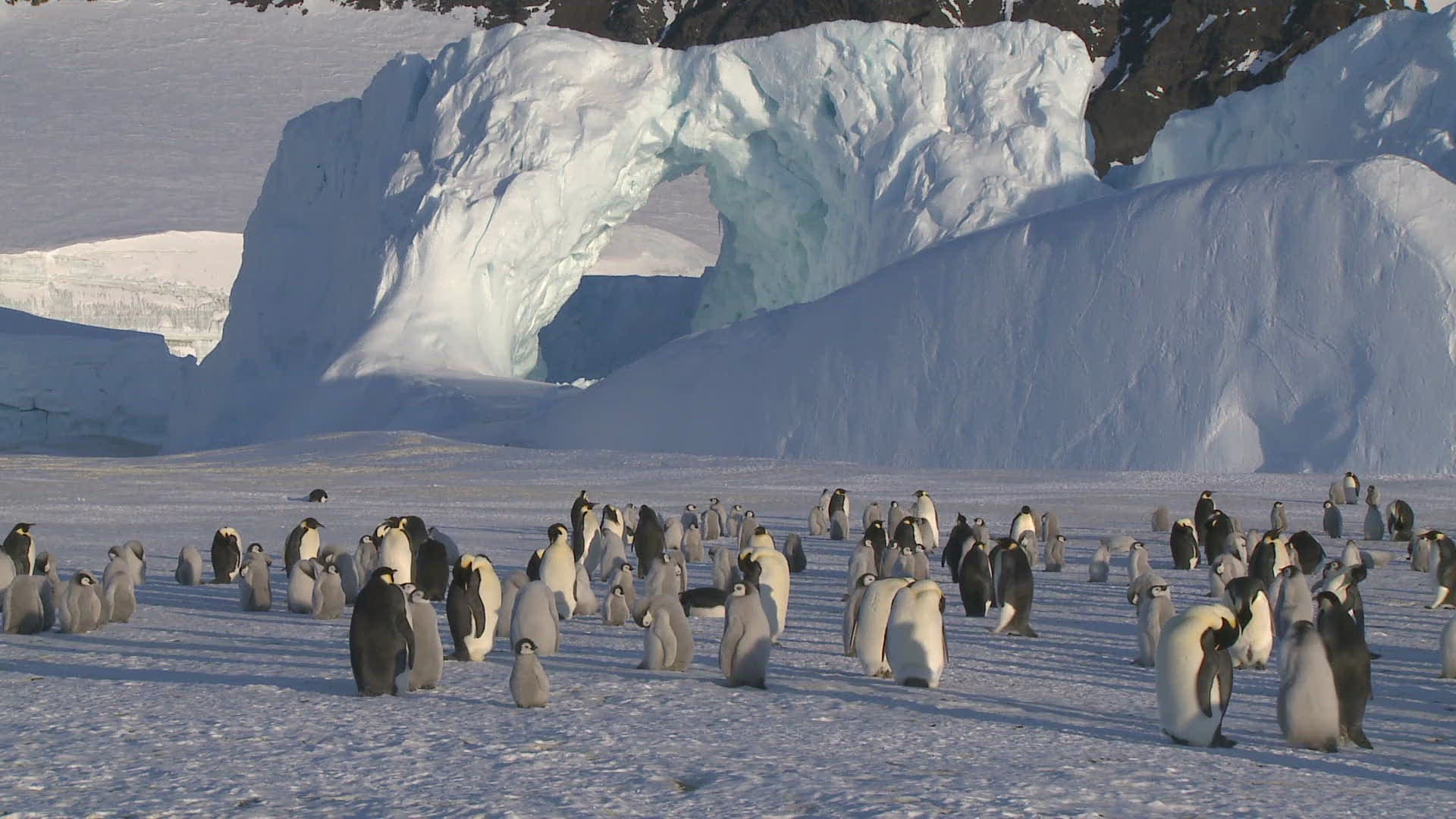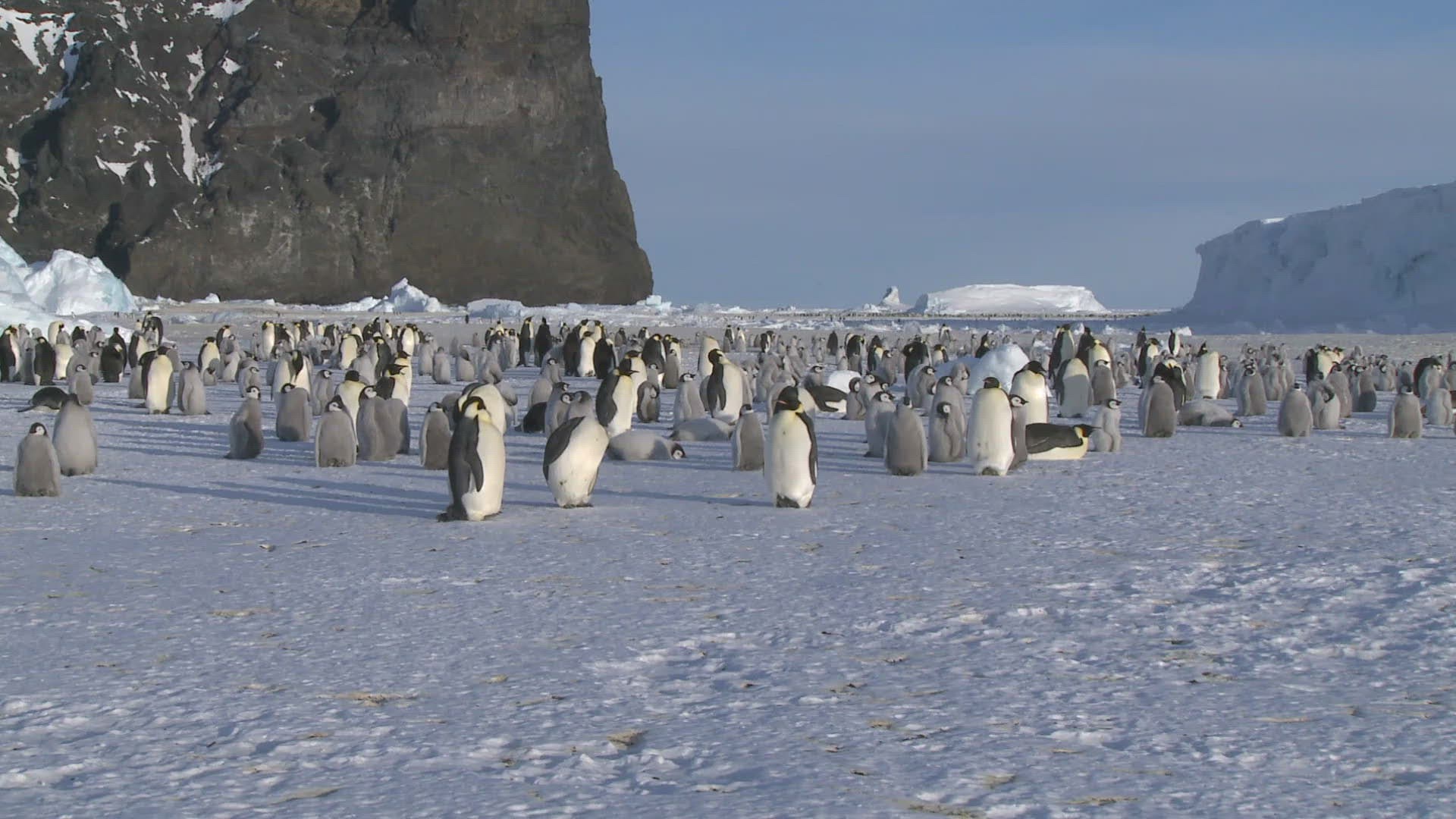 Long shot of thousands of King Penguin overlooking a rookery at Gold Harbor on South Georgia. King penguins breed on subantarctic islands and gather in large rookeries on South Georgia.