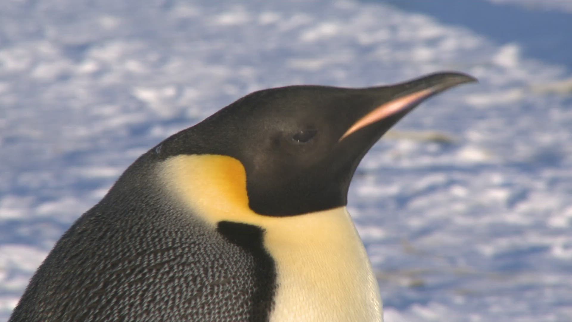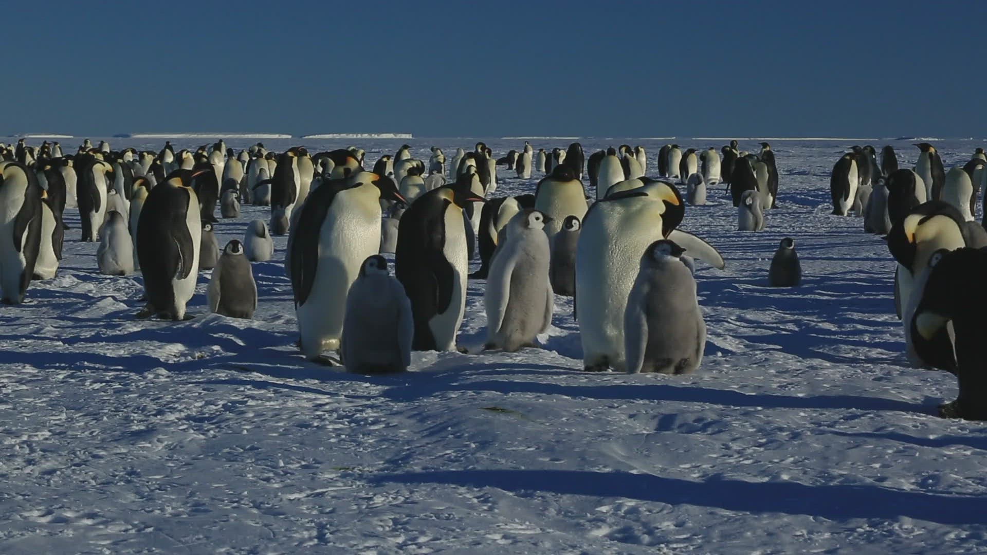 Static shot of King Penguins on the beach overlooking a rookery at Gold Harbor on South Georgia. King penguins breed on subantarctic islands and gather in large rookeries on South Georgia.