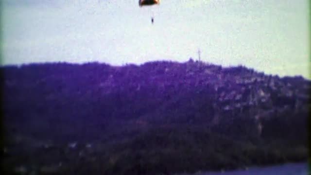 > 1974: Tourist man parasailing beach launch and safe landing. ACAPULCO, MEXICO