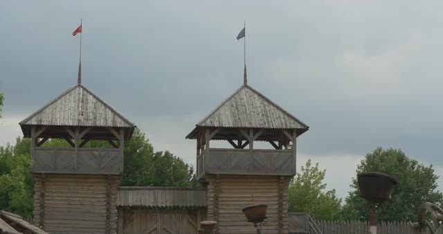 Kiev/ukraine - Jul 14 2015: Actor in Pink Costune and Hat as Prince Vladimir the Great is Standing in Front of City Gate Arch, Photographer is in Front of the Actor, Gate in the Ancient City Protective Wall, Wall on the Green Hill, Road to the City, Wooden Fence,ethnographic Museum at the Open Air, Kievan Russ City, Summer, Outdoors, Daytime