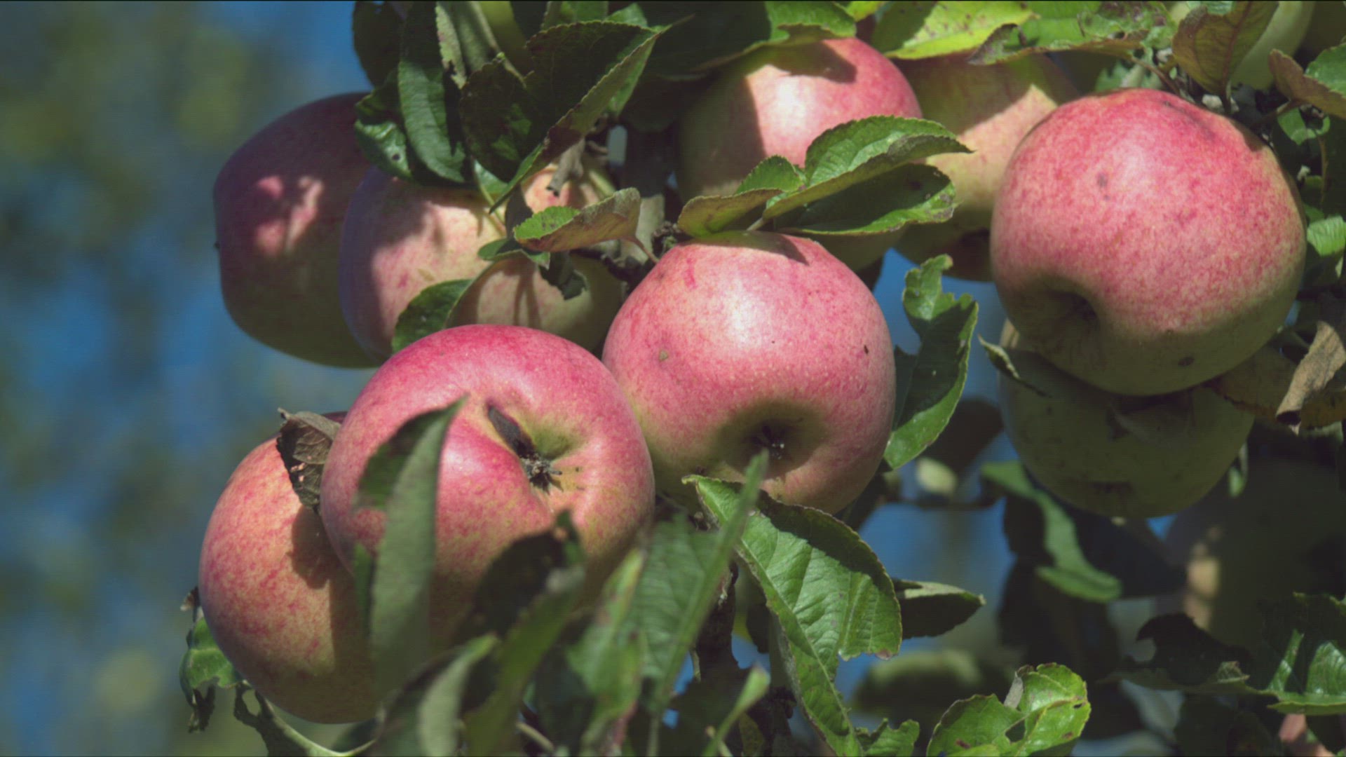 Visible Apple Branch With Big Pink Apples Swinging From a Strong Gust of Wind Under the Warm Rays of the Sun in the Last Month of Summer During Fruit Ripening