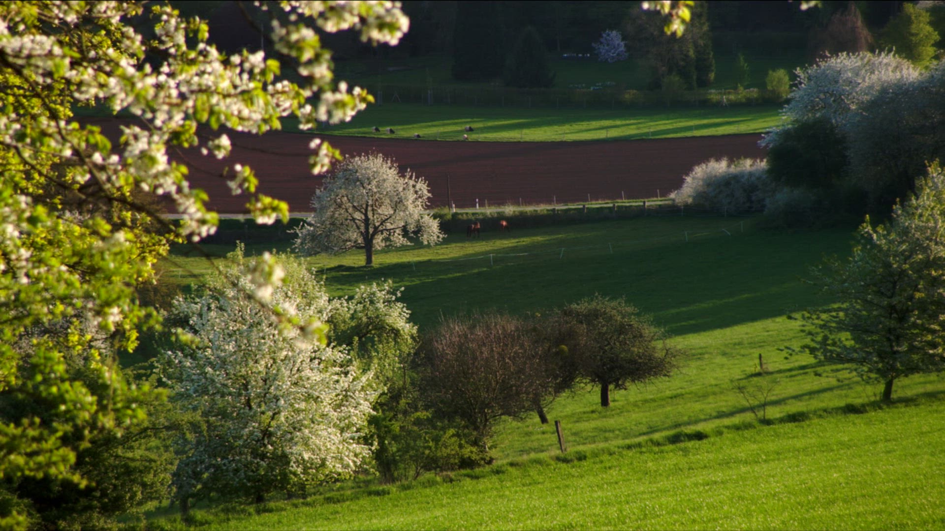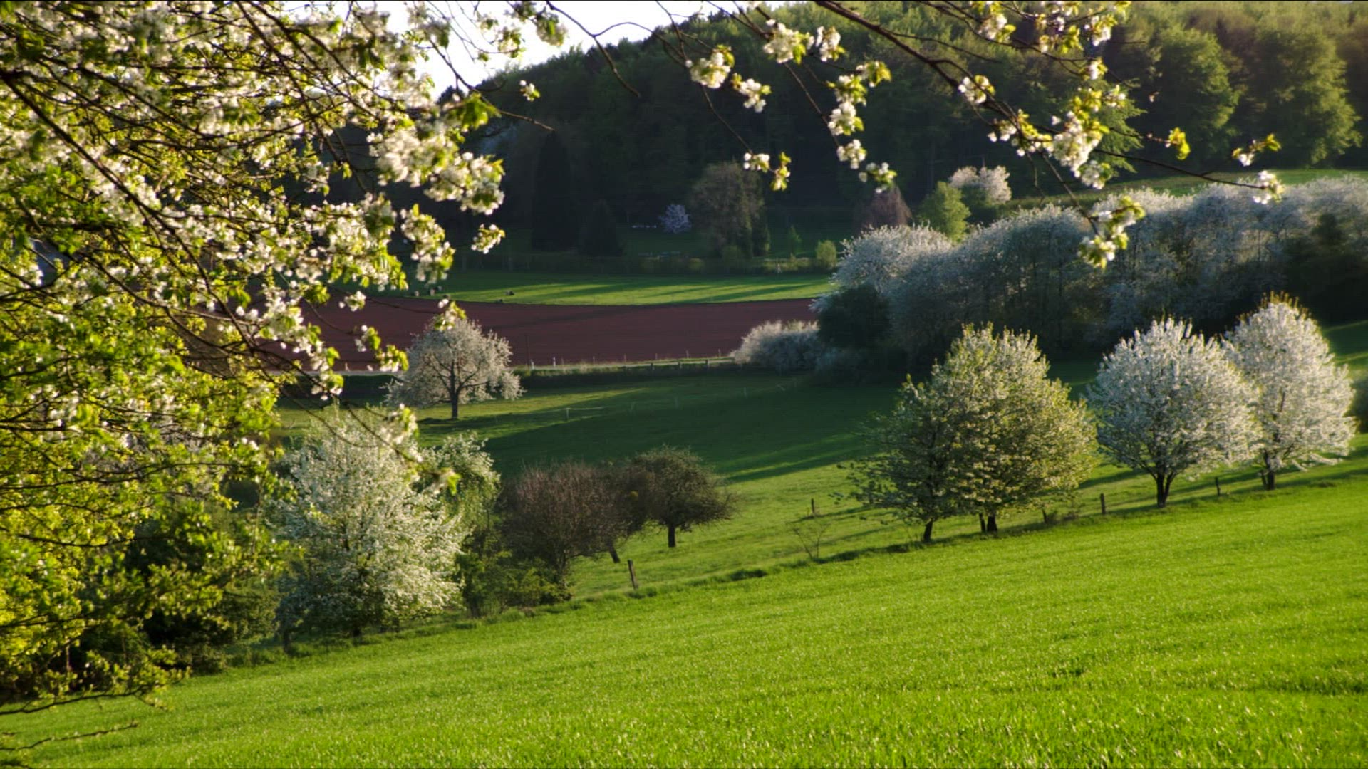 > Green Apple Tree Branch With Ripe Fruits Swaying in the Wind in the Sun in the Summer Garden