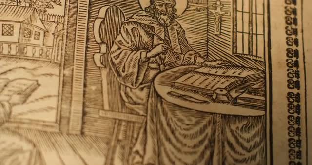 Monk's Hands Are Leafing Through an Old Book Carefully in a Typography, Touching a Yellow Pages of Ancient Slavic Manuscript in the Light of Candle in Dark Room, Monk is Reading a Tale of Bygone Years, Primary Chronicle, Eastern Slavs' History, Nestor's Chronicle, Nestor's Manuscript, Monk is in Black Garments, Man With Beard and Nustaches in Hood