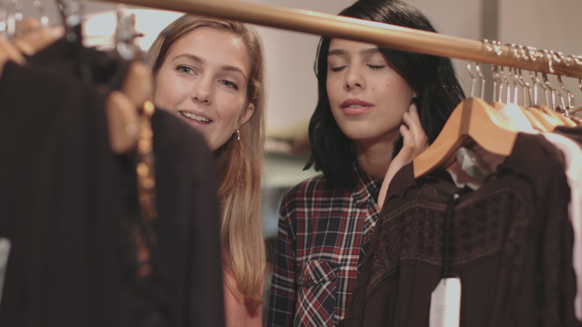 Delighted Woman is Talking, Telling Something, the Other One is Drinking a Coffee and Listening, Two Women, Friends Are Enjoying to Buy a Clothes, Sitting on a Sofa at the Boutique, Happy Clients Are Talking Friendly, Young Brunette Women With Long Hairs Are Buying a Clothes in a Boutique, Girl in Pink Mini Dress, Midi Dress, Standing Among Rows of Clothes, Womenswear, Clothes Shop, Colorful Garments Are Hanging on a Trempels in a Line, Light Room, Indoors