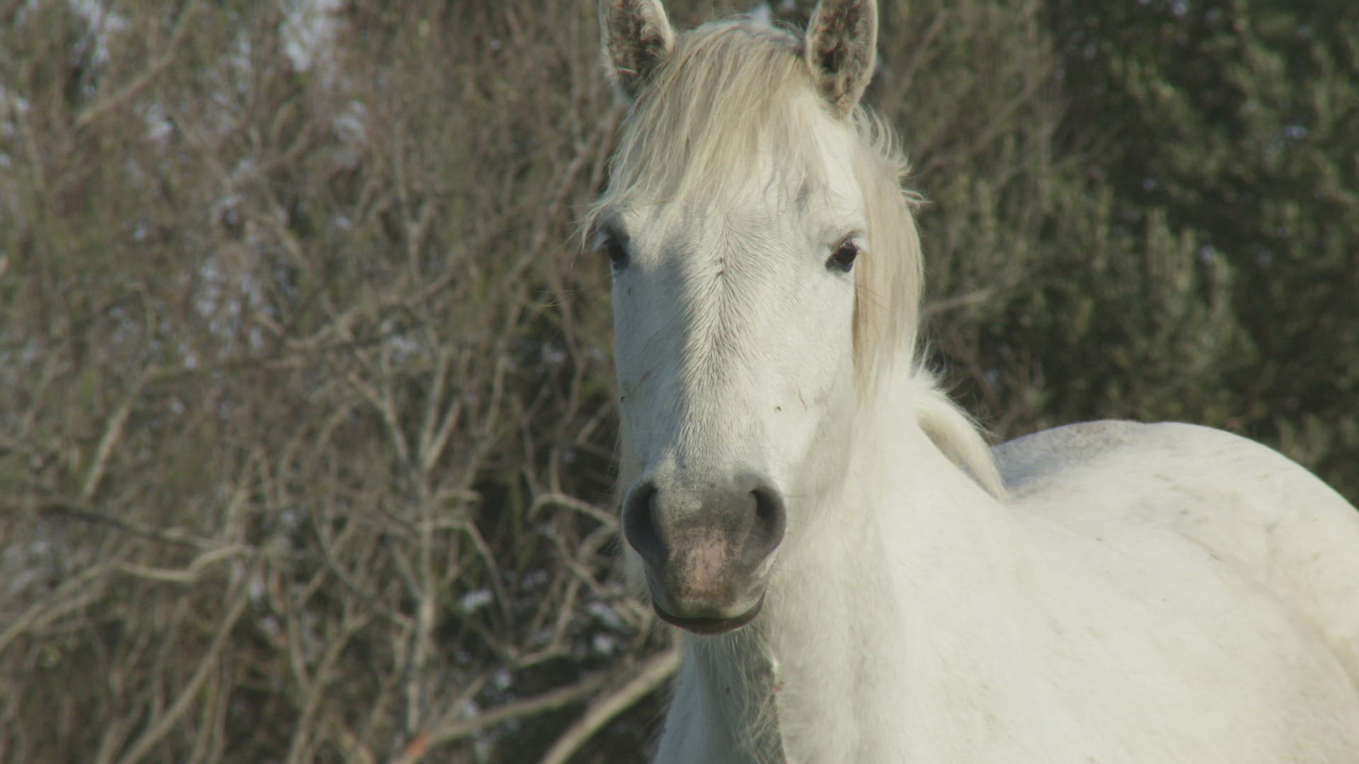 > White horse with a burlap sack that covering his eyes eat hay at the ranch