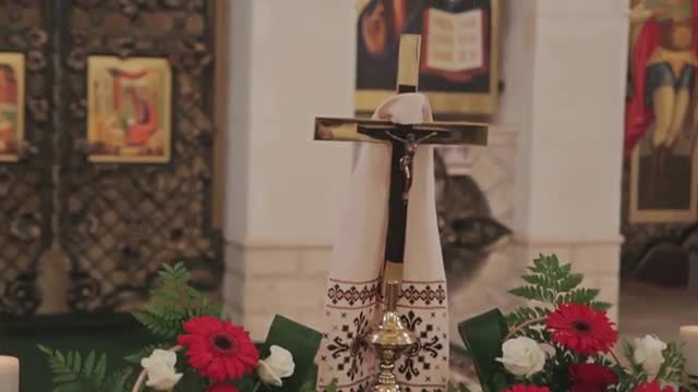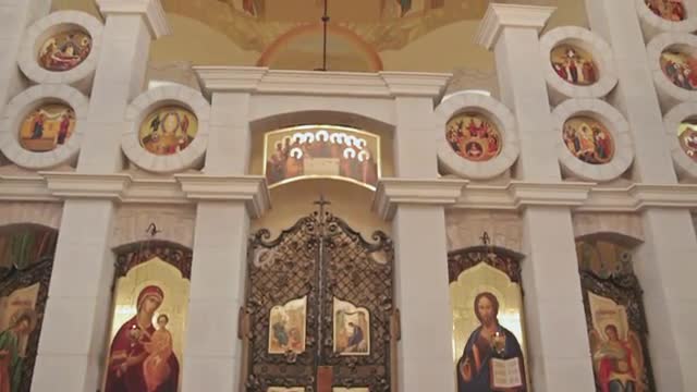 Kiev/ukraine - Nov 24 2015: People at Tower of St. Michael's Golden-Domed Man Monastery in Kiev, People Are Walking Across a Sqare at Bell Tower With Clock, Leaving the Yard, Church Painted in Blue, Arch Entrance, Frescoes Close up at the Entrance on a Walls, Angels Are Painted o n a Picture, Semicircular Window, Golden Cupolas, Parked Cars, Bare Branched Trees, Cloudy Sky, Daytime, Ukraine
