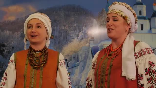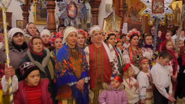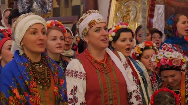 Kiev/ukraine - Jan 08 2016: Female Folk Singing Group in National Clothes at the Holy Mountains Lavra, Female Chorus is Performing Christmas Songs Without Instrumental Accompaniment. Dormition Cathedral, Ukraine, Christmas Celebration, Women in Flowered Shawls, Colorful Tapes on Their Heads, National Headdresses, Embroidered Shirts, Beads, Women of Different Ages Are Singing Indigenous Ukrainian Christmas Songs, Crowd of People Are Standing in a Church and Singing, Christmas Decoration in a Church, Indoors