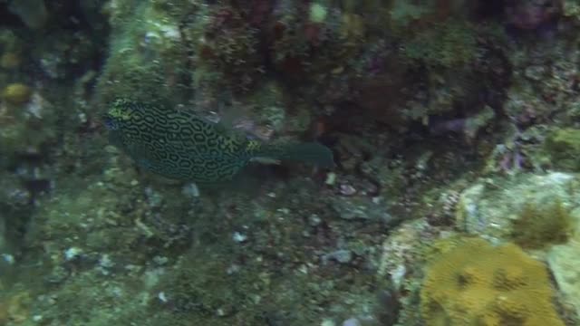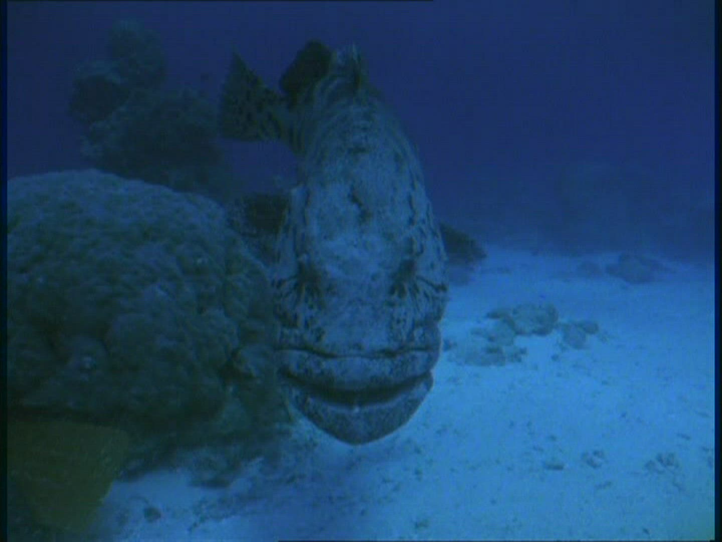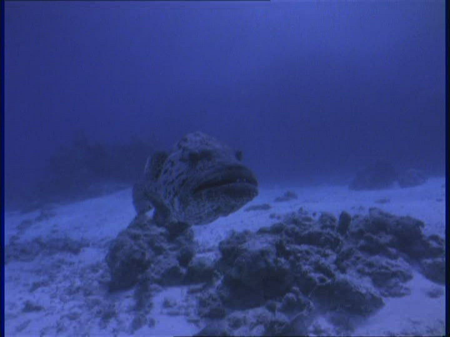 Large Gray Spotted Grouper With Sharp Fins Swims Close by the Camera in the Blue Water on the Background of Seaweed