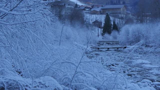 > Facade of a Wooden Church Snow on Its Roofs Forest Bare Bracnhed Trees Are Around Wintry Landscape o