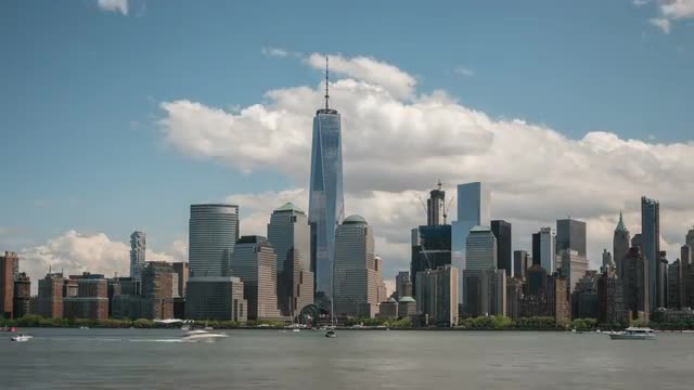 (Time-lapse) Clouds move over the Hudson River and lower Manhattan skyline in New York City.