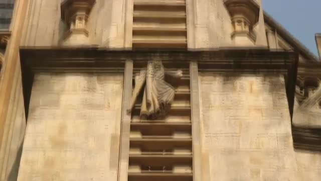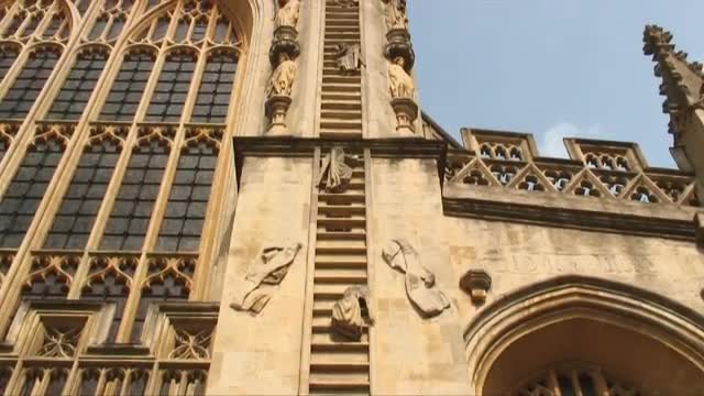 55958 - Tilt up shot of Jacob's Ladder sculpture on a church in Bath, England.