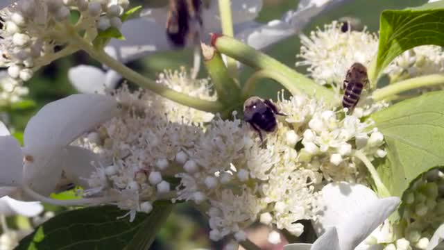 Bumble bees and honeybees foraging & flying around Hydrangeas together