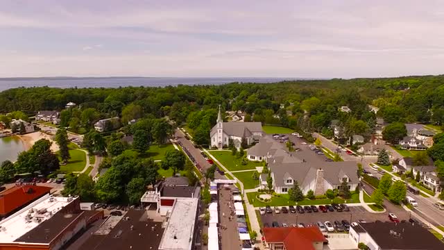 > Cathedral spires projecting above a town in England.