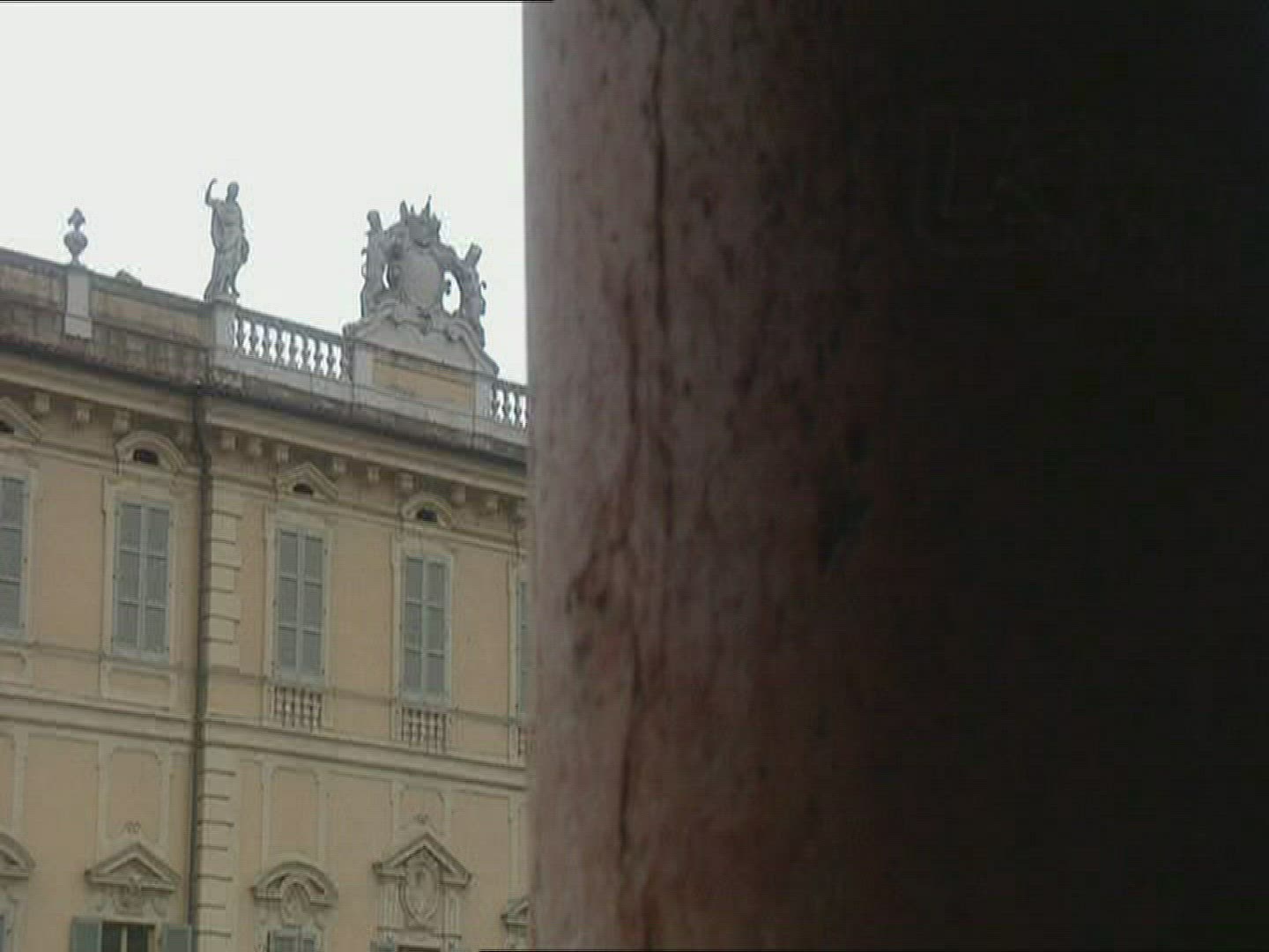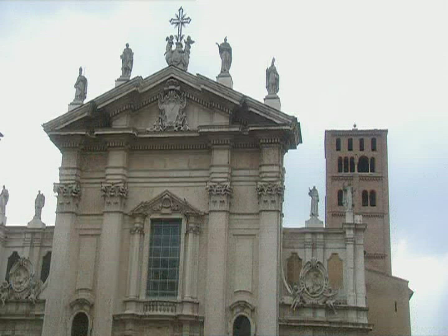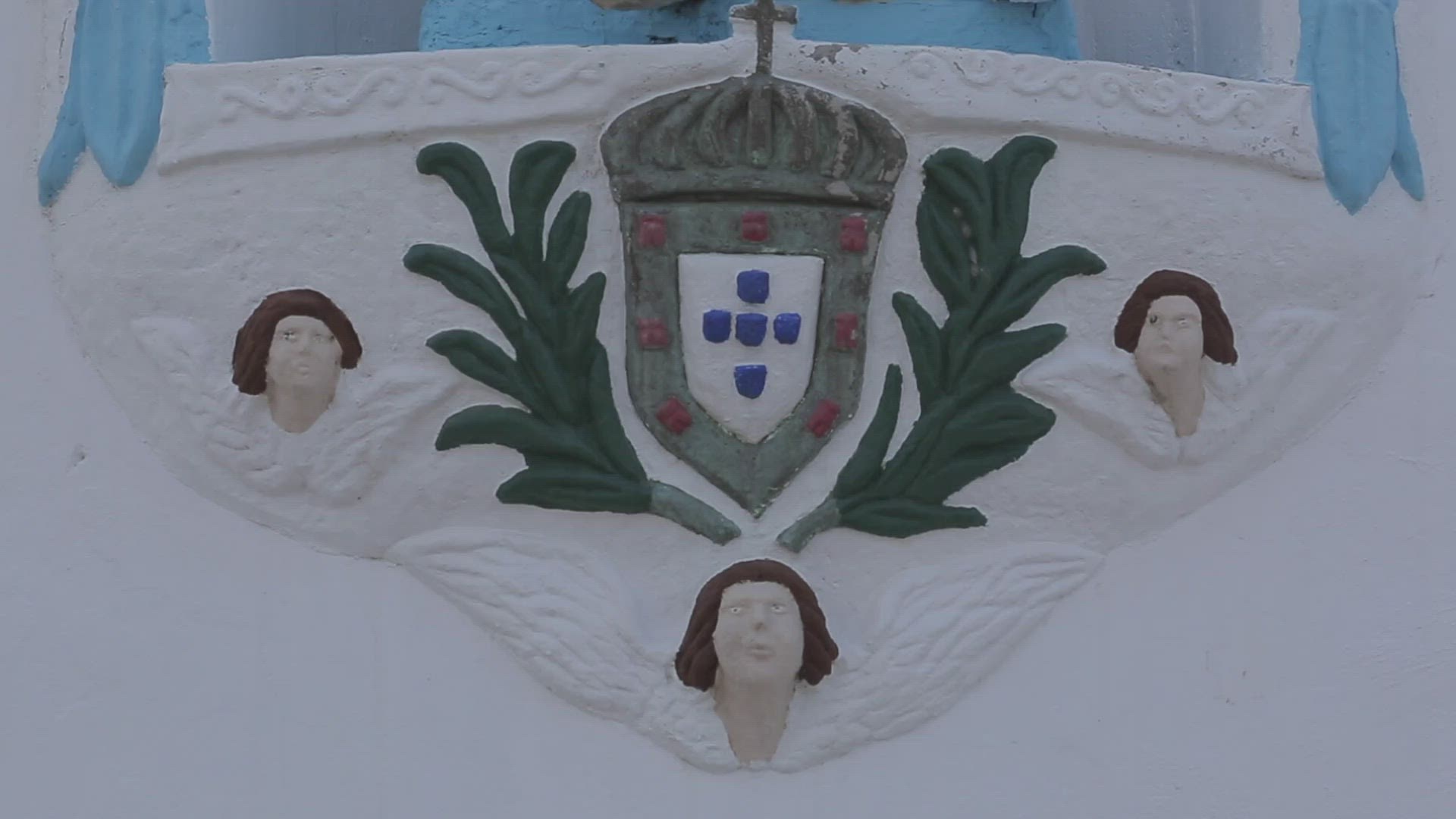 Tilt up shot of a sculpture of Jacob's ladder on a church in Bath, England