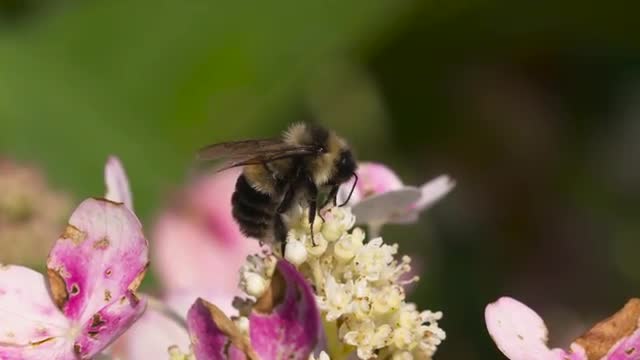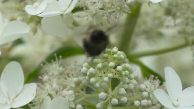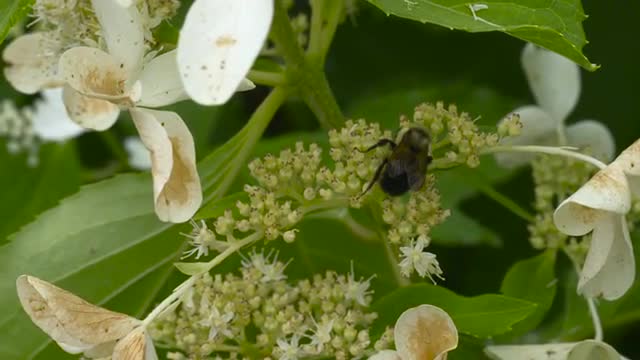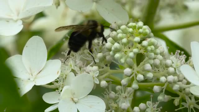 556719 - Bee feeding on hydrangea flowers, medium wide shot